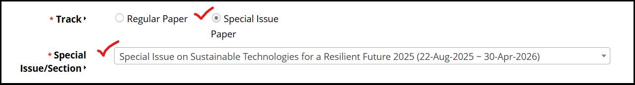 - During Online submission, you must select Special Issue Paper from the Track menu and then select Special Issue on Sustainable Technologies for a Resilient Future 2025 in Special Issue/Selection. (Screenshot attached below)