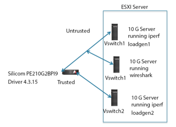 In our environment, the TAC gateway incorporated a 10 Gbit/s multimode Silicom brand optical switch (model PE210G2BP) with optical bypass switch driver ixgbe ver 4.3.15. The optical bypass testbed is shown in figure 5. We configure two ESXi server instances, each driving 10 Gbit/s of traffic (loadgen 1 and loadgen 2, respectively). These servers run the Iperf benchmark test, enabling us to test switch times and throughput in both directions. As shown, the virtual switch on server loadgen1 connects to an untrusted port on the TAC gateway, while the virtual switch on loadgen2 connects to the corresponding trusted port.