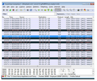 In order to determine how long it would take for the optical bypass to tansfer traffic under different conditions, another server was inserted as a tap on the untrusted link, as shown in figure 6. By running WireShark on a 10 Gbit/s interface, this server is able to measure the effective switching times. A representative WireShark trace, shown in figure 7, confirms that the gateway bypass switch exhibits 110 ms recovery time upon a power failure to the gateway. We found that recovery time was faster when simulating a firmware outage (53 ms) and slightly longer when the TAC cloaking function was suspended due to a firmware problem (257 ms).