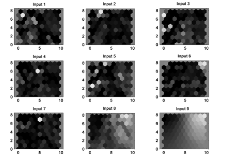 The NARX model (2) is also found capable of learning the underlying behavior of the network traffic data. The function Bayesian Regularization is used for training purpose as it produces the better generalization for a complex and noisy data. The principle of adaptive weight minimization is followed to stop the training. In this model, the previous two states of the input-time-series and the target-time-series are taken into account to predict the next value in the output-time-series. The regression value is found to an acceptable level as R=0.983. An important graph of the NARX model, i.e., the time-series response is shown in Figure-3. A close similarity can be seen between the outputs and the targets. The lower part of the graph shows the error graph which is found well within the confidence interval. The objective of testing the SOM model over the traffic data is to reduce the data-dimensionality to see which variables are more intrinsic to the resource-requirement. A network of 100 neurons fully mapped the underlying data space. The impact of the variables on the network is fully conveyed in the input weight-planes. All the input weight-planes corresponding to the input variables are given in the Figure-4. The weight-planes for the input-1 to the input-7 contain most of the part as dark regions indicating zero or lower values for the weights between the network-neurons and that particular input. This would suggest the days of the week are not to play much role in deciding the network resource management as the traffic varies. The weight-plane for the 8th input variable, i.e., the hours, comprised of more bright spots and fewer dark ones presenting a strong connection strength with the network-neurons. The 9th weight-plane owns much of the bright spots as compared to the rest of the weight-planes showing the resilient connections with the neurons of the network.