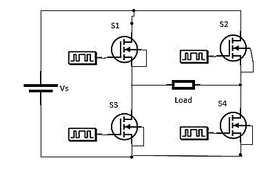Figure 2 shows the full bridge single phase converter. It is composed of four switches (of which the mostly used switch is MOSFET), with source and load. The flow of power in the inverter varies after every half cycle.