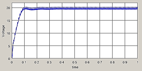 There is an overshoot produced at 0.1seconds but till 0.2 seconds the voltage stabilizes completely. The ripples produced in the output are due to the capacitor of a smaller magnitude being used. If the value of capacitor is increased the output stabilization time will be high.
