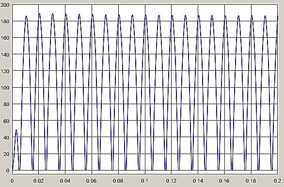 In Figure 6, the voltage at the output of the full bridge converter is displayed. It is observed that the voltage can be stabilized at around 190 V till 0.02s with the help of high capacitances.