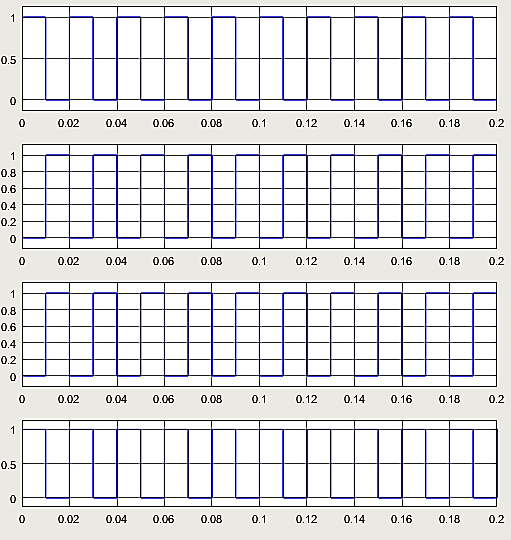 The switching signals provided to the H-bridge have been represented in Figure 7. The four signals (from top to bottom) are being provided to the four switches from ‘S1’, ‘S2’, ‘S3’ and ‘S4’. For controlling on side of the H-bridge ‘S1’ and ‘S3’ are used while ‘S2’ and ‘S4’ are used for controlling the other end of the H-bridge. It can be viewed that while ‘S1’ (signal waveform 1) is switched ON, ‘S3’ (signal waveform 3) remains OFF and vice versa while when ‘S2’ (signal waveform 2) is switched ON, ‘S4’ (signal waveform 4) remains OFF during that interval and vice versa.