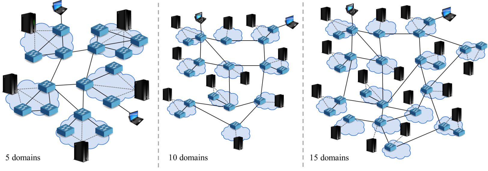 In Experiment 1, we focused on traffic loads of communication between SDN controllers. We arranged three networks: each network consists 5, 10, and 15 domains, respectively. The number of inter-domain hops between source domain and destination
