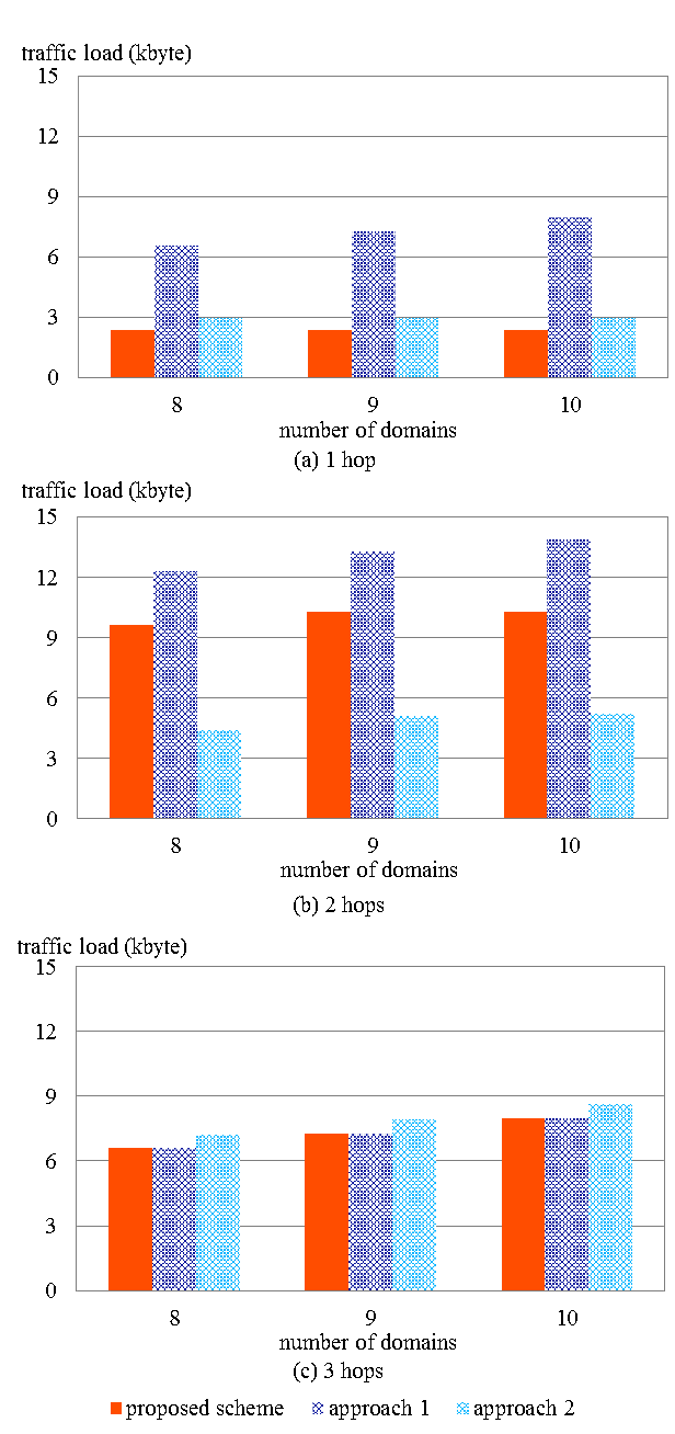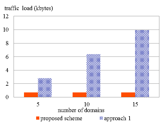 Figure 11 shows how the traffic load changed as the number of domains changed. In case of approach 1, traffic load increased according to the increase of number of domains. In contrast, traffic load in the case of proposed scheme did not raise even though the number of domains increased.