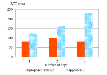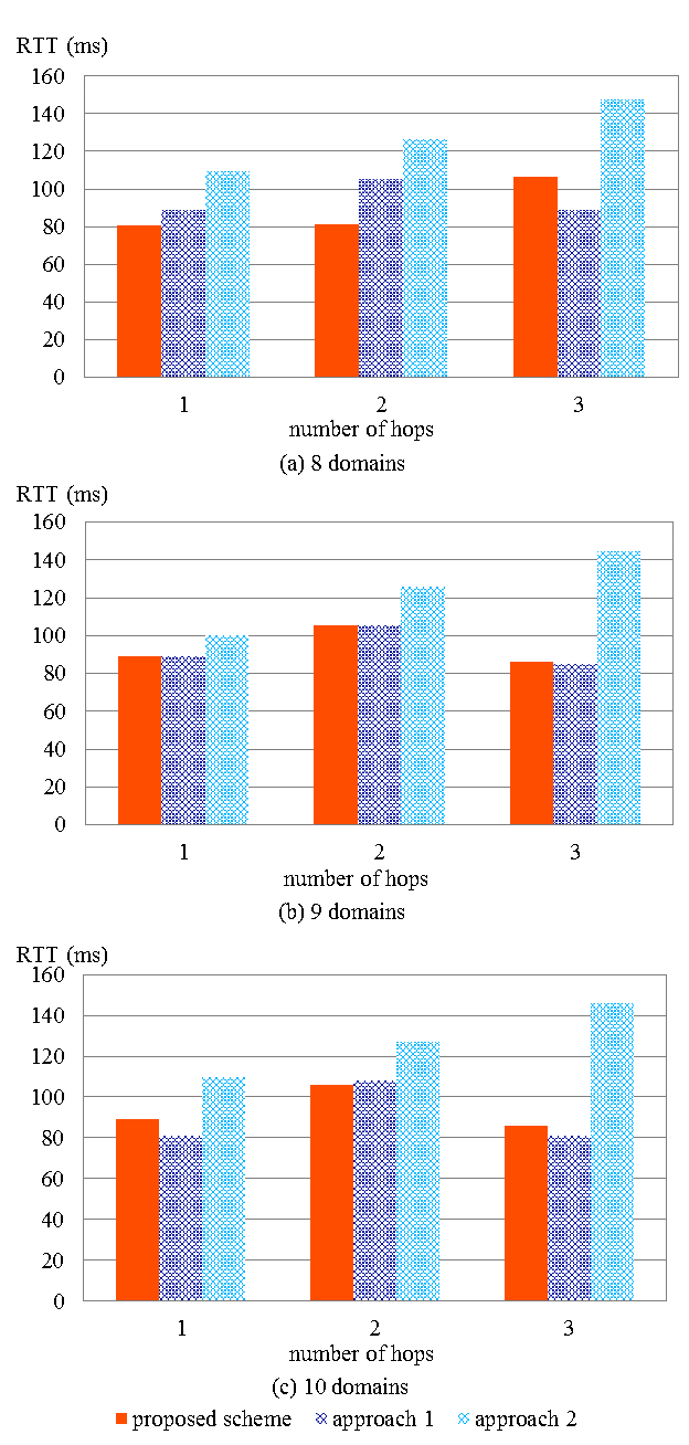 Figure 13 shows the result of Experiment 2. In the case of approach 2, RTT increased according to the increase of number of inter-domain hops between Dd and Ds. In contrast, the proposed approach succeeded to keep RTT less than that of approach 2 in any case.