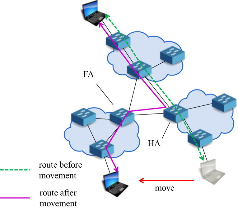 - Rewrite the source IP address of the packets sent from the MN to the CN from current IP address to former IP address.