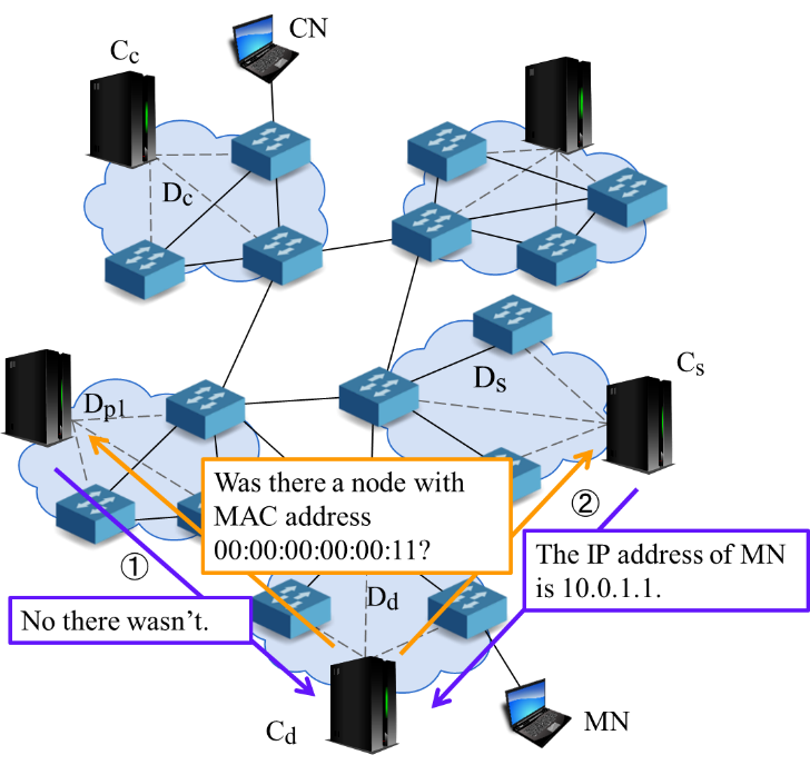 Cd sends queries in order from neighboring domains like in Figure 6. SDN controllers of the domains that received the query search their domain to check if MN belonged to, and sends the result to Cd for a reply. When MN was not in their domain, they reply the absence of MN. When MN was in their domain, they reply the IP address MN was using.