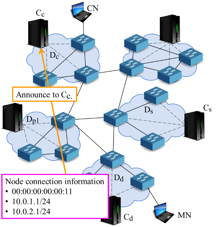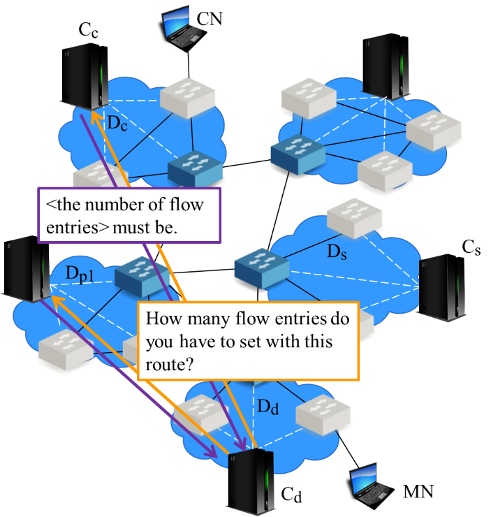There were two major trends in ways to handle inter-domain handover with SDN. One approach is to use Mobile IP when inter-domain handovers occurs [8]. By using Mobile IP, SDN controllers doesn’t need to search for domains to exchange information of MNs. However, Mobile IP has difficulty in communication route optimization. Another is to announce information of MNs to every controllers in the network [7]. This approach allows the communication routes to be optimized. However, with a network consisted of many domains, communication for the announcement might compress the communication bandwidth. These conventional approaches could only realize efficient data exchange or route optimization.