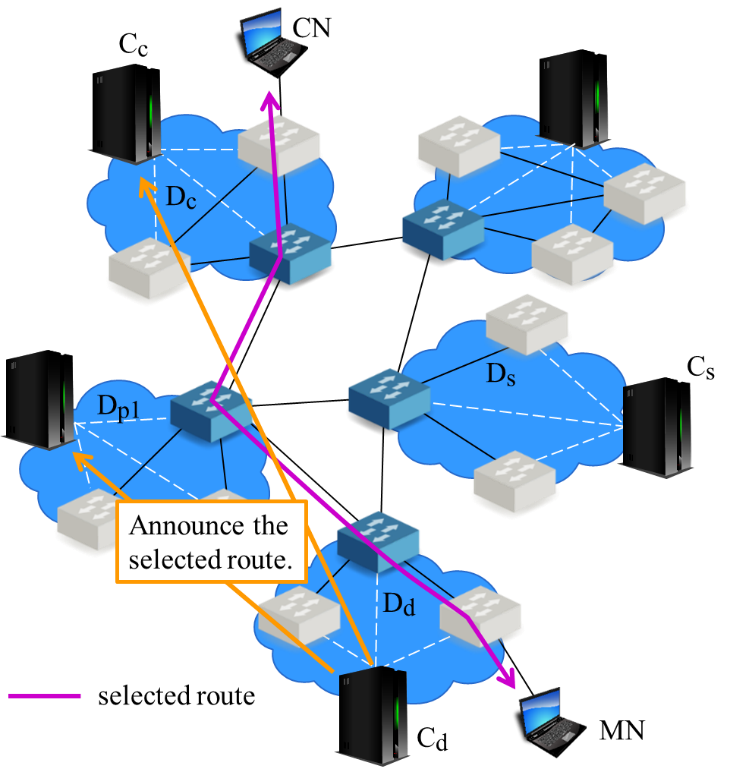 - Cd announces the route information to the SDN controllers of the domains to go via the selected route.