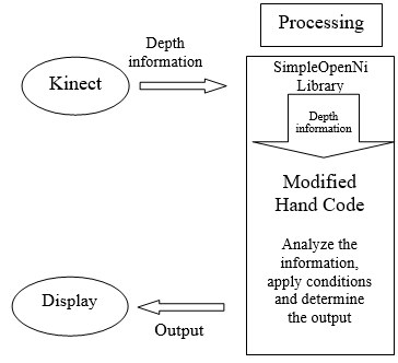The Kinect will be connected to a computer with a Processing program designed to detect gestures and respond accordingly to them. Since we only needed the 3D imaging of the Kinect, 2D images were not used and thus the real time streaming of the surrounding environment was done in grey scale images of the Kinect sensor.