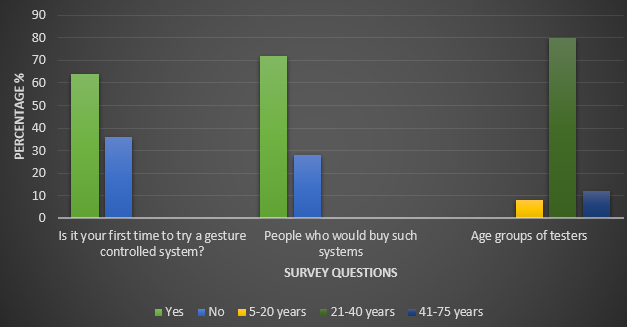 Statistics were made based on new review from test users of the system, where two surveys was conducted concerning the concept of the system as a gesture based control system, whether users had previously used similar system and if they would buy such a system themselves (see Figure 14). The survey was done on social media and on field with test users.