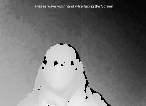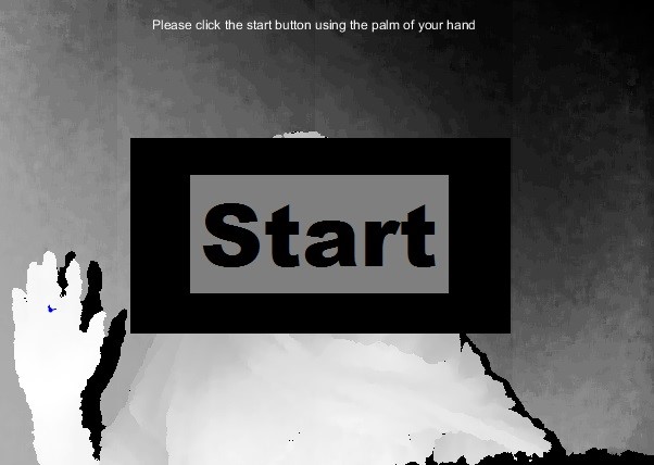 The user faces a Kinect sensor and a Screen that will display to him the program he will interact with. The screen displays the user’s depth image, this shows that the program still isn’t functional till the user waves his/her hand, then a “START” button will be displayed in the middle of the screen (as seen in Figure 8) announcing that the program is ready and waiting for the click of the user.
