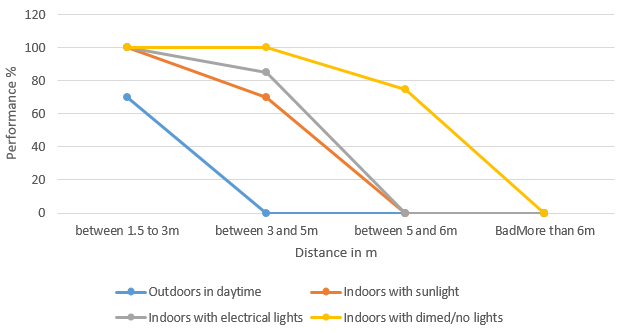 To test the performance of the system under different conditions we decided to perform the test with a single user but on different distances, and in different lighting conditions.