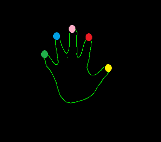 Finger’s gestures and movements were used as the events that control the system. So we first eliminated the depth image (the grey-scaled 3D-image captured by the Kinect seen in Figure 2) and only drew the contour of the hand along with the fingertips (fingertips displayed in red and contour in green in Figure 2) with a rate approximate to 30 fps (frames per second), which is the frame rate of the Kinect, on a black background, and like that we were able to observe the real-time motion of our fingertips on screen. Next, fingertips previously drawn as 2d images were replaced by special 2D graphics known as “Sprites” as displayed in Figure 3. Sprites are 2D images that have special properties with boundaries and libraries that allow us to detect the collision between one sprite and the other, set their properties, motion, speeds and so much more. The library used here is called Sprites library, and allows us to control all the previously mentioned properties of sprites.