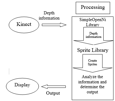 The programming language used was Processing, which is a free open source programming language and runs on Mac, Windows, and GNU/Linux platforms. Processing has many libraries related to Kinect, and because it was easy to learn and because it is an object oriented programming language, it allowed us to have more flexibility when dealing with Kinect input and manipulating information and output.