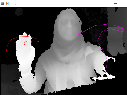 The Finger Tracker library was our first alternate for gesture detection where it detects the tips of the fingers of the user. It does that through slicing the space detected by the Kinect into layers of 2D surfaces and then determining the fingertips through scanning each 2D surface and finding “inflections in the curvature of the contour” then drawing red ellipses in their positions, as seen in Figure 2.