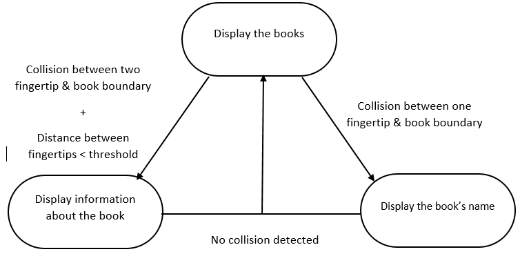 Two events were defined to control the system and change its states, a pointing gesture and a pinching gesture.A loop was used to iterate over the seven pictures given, then a condition checks for any collision between any book and a predefined fingertip (detected when the user is pointing at the book) which is shown using the yellow sprite in Figure 2. If the condition is satisfied, the name of the book that the finger sprite collided with will be printed on screen (see Figure3). Then the loop iterates over the books again to check for collisions. To select the required book two fingertips were used, such that if a pinching gesture was performed and the distance between the boundaries of the finger sprites was smaller than a certain threshold and the collision between these sprites and the book sprite was detected information about the selected book will be displayed, thus the system would transit from the initial state where the books are displayed to either state depending on the detected event; a pointing gesture results in displaying the name and a pinching gesture results in displaying the information. The following state chart displays how the system transits between states based on the events created by the user. (Figure 5)