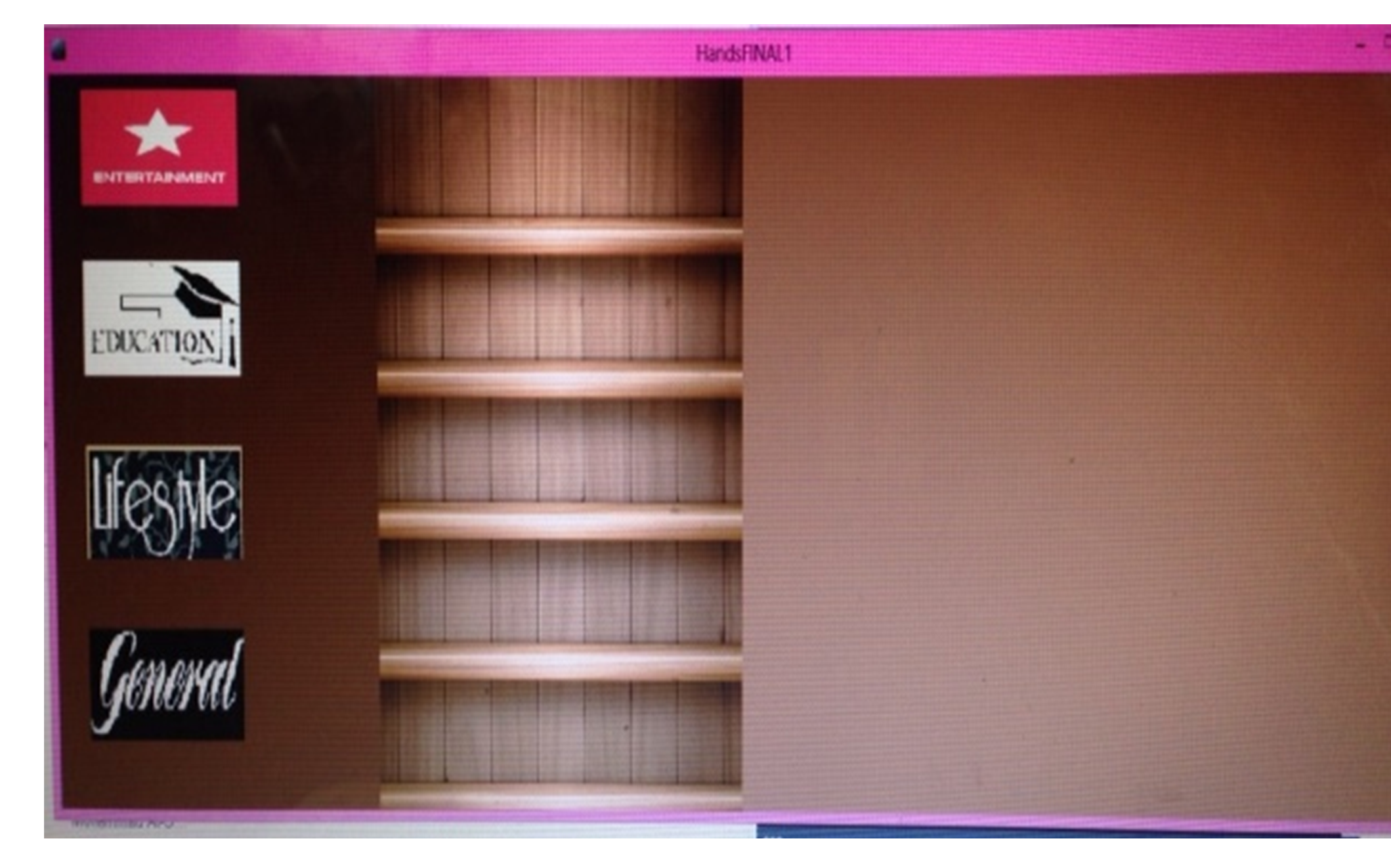 As the user clicks the start button, a new screen will appear with the topics of the available books displayed on the left side of the screen, and empty shelves in the middle of the screen, as seen in Figure 10. Here the condition was to perform the click gesture within the boundary range of the start button.