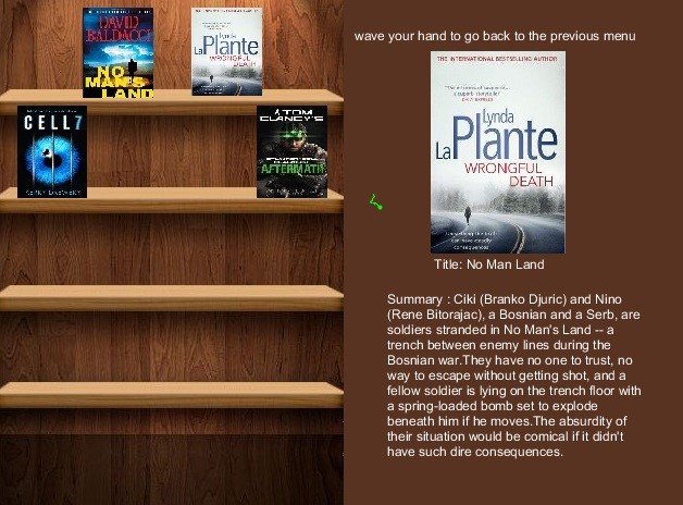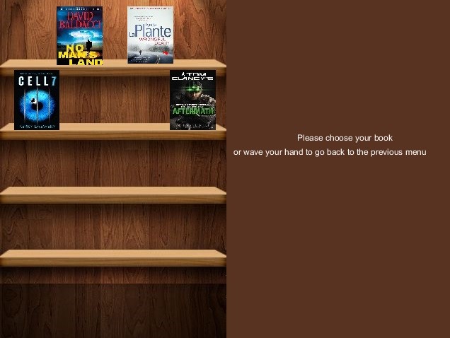 Then the system was programmed to respond to a certain gesture in a certain position where the position is the other attribute of the events that allow us to change the state of the system and therefore navigate forth and back through them, so that if the user wanted to select a certain topic or book all he had to do was to click on the image of that topic or book and after getting the required information, a simple wave of the hand allows the user to go back to the topics menu or to the collection of displayed books, allowing him to navigate back and forth within the system.