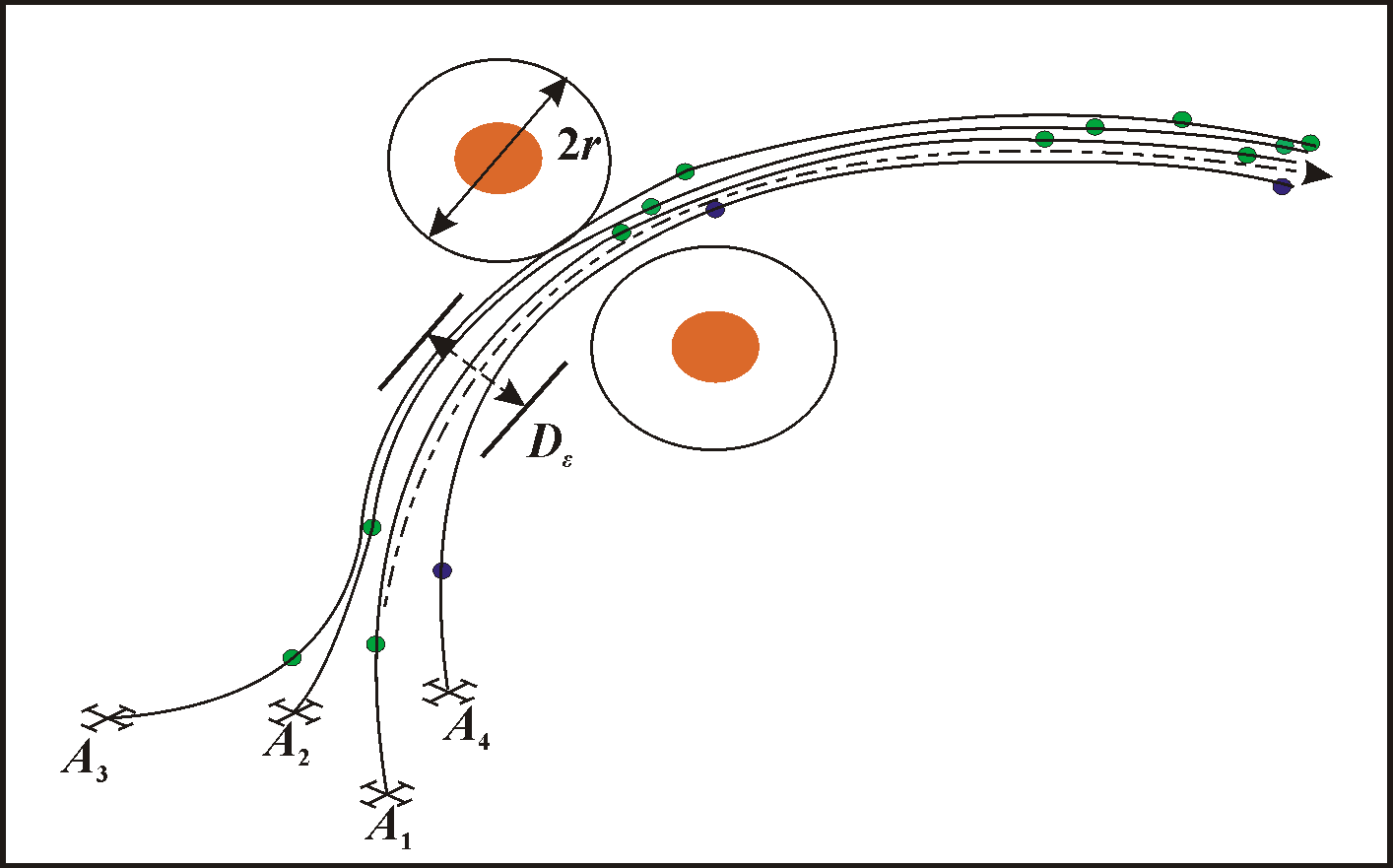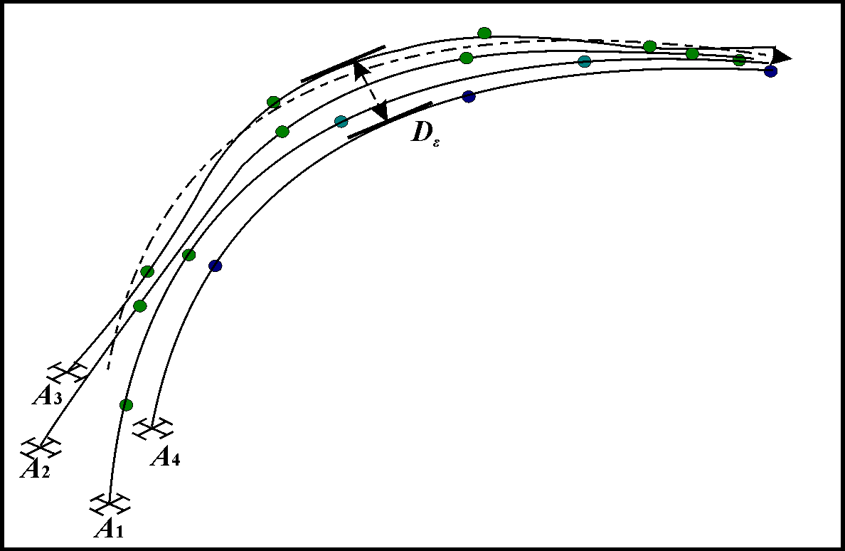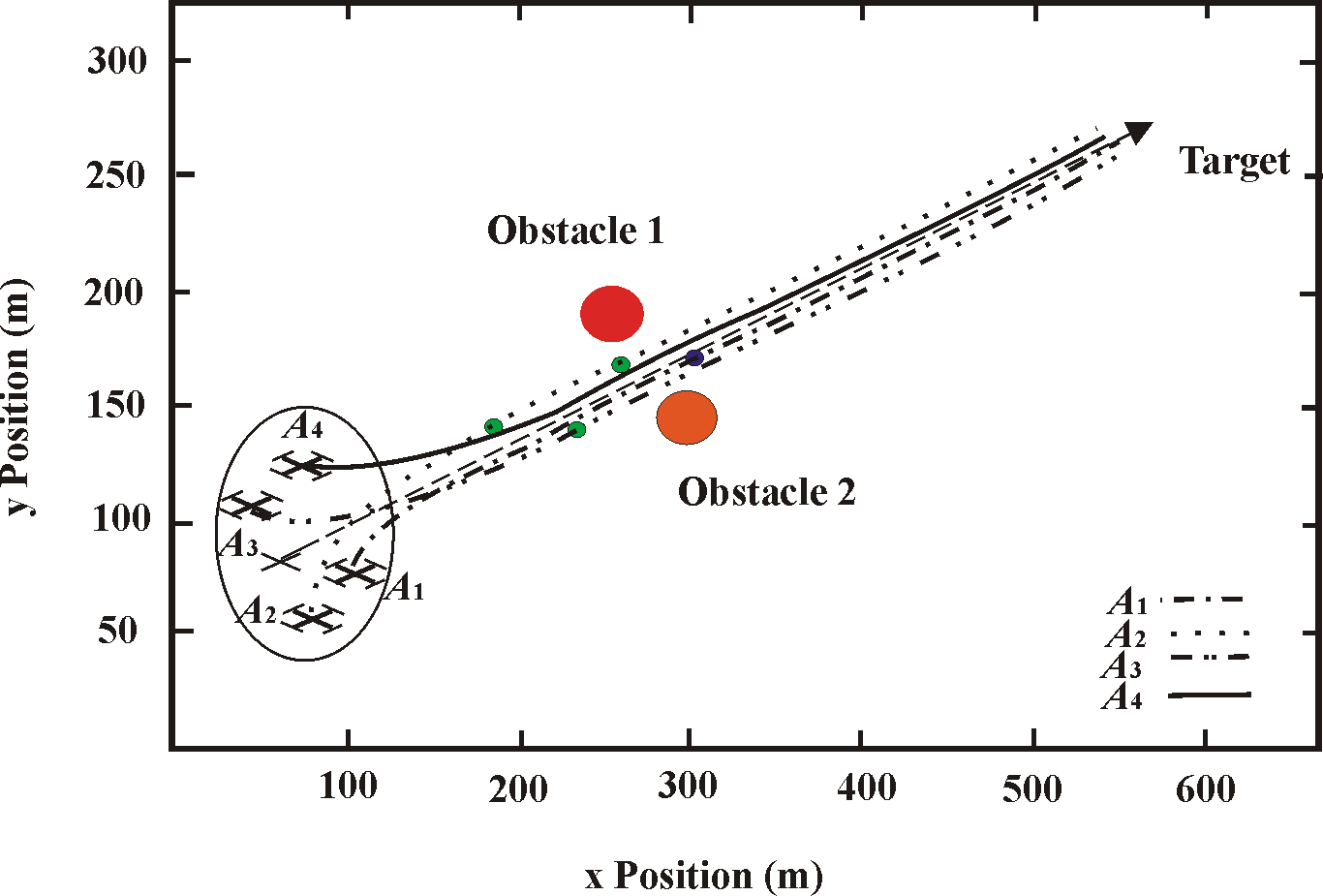 Figure 8 represents reconfiguration of the group of UAVs in line type motion, if there are located obstacles on the route side-by-side. In this case, the tactic of UAVs is similar to column and UAVs follow in rigidly defined order: A4 ® A3 ® A2 ® A1, where A1 is the first and A4 is the last.