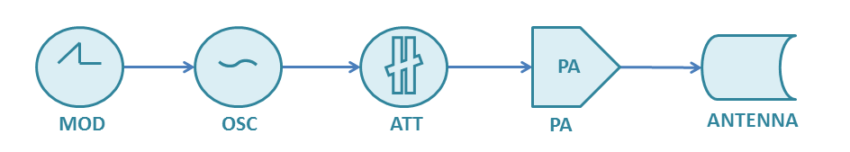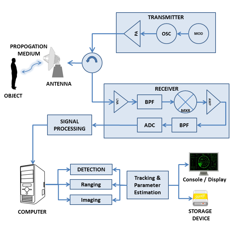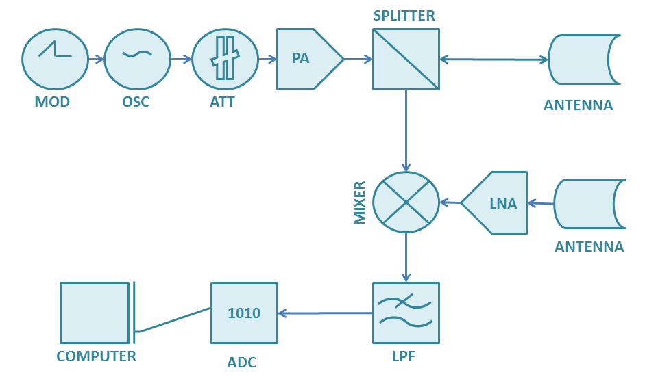 An FMCW radar comprises fundamentally of a transmitting chain and a receiving chain collectively known as transceiver along with a data acquisition device. The transceiver is a small in size, portable and a light weight module which typically consists of the antennas integrated as standalone transmitter as well as receiver antennas. An RF wave typically in microwave region is produced by a Voltage Controlled Oscillator (VCO) which can be a modulated waveform which directly feeds the transmitting antenna, or even its strength may also be amplified by employing a power amplifier. A typical form of transmitting chain is shown below.