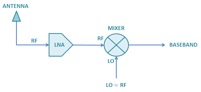 The RF signal is fed into the mixer in Direct Conversion Receiver the same way as in superheterodyne receiver [6]. In contrast to the superhet, the frequency of LO does not have an offset from RF frequency. The outcome is a demodulated baseband output signal just like the one obtained from a superheterodyne technique employing synchronous detection following an IF stage [10]. To put it differently, the down conversion is performed in just one frequency transformation. This prevents the complication of superhet like image rejection problems, IF stages and a couple of frequency conversions.