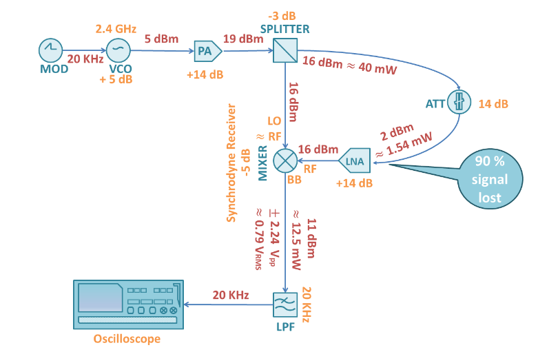If the transmit bandwidth of 300 MHz is maintained which is within the frequency range of Data Acquisition Devices (DAQ’s) and if the modulation frequency to the VCO is known in real time, then it can be directly down converted from 2.4GHz using stolen carrier from the transmitter. But it is coupled with a problem that the received signal varies over the frequency range of 300 MHz. This seems like there is high rate frequency hopping in the receiver system, which can be tackled in signal processing, when received data is parsed taking reference from the synchronization pulse from the modulator. This design is given below assuming similar characteristics of propagation loosing 90% of the received signal.