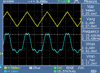 The type of filter employed was Sallen Key Active filter topology simply because it provides a straightforward to execute filtering topology. The cut-off frequency can be adjusted by altering an individual resistor or a capacitor value. The filter constructed in Lab was tested on an oscilloscope at multiple frequencies and a bode plot was produced for the analysis of the constructed LPF. One such reading is shown. The yellow waveform is the input frequency signal and the blue waveform is the output signal that has been passed through the Sallen Key Low Pass Filter.