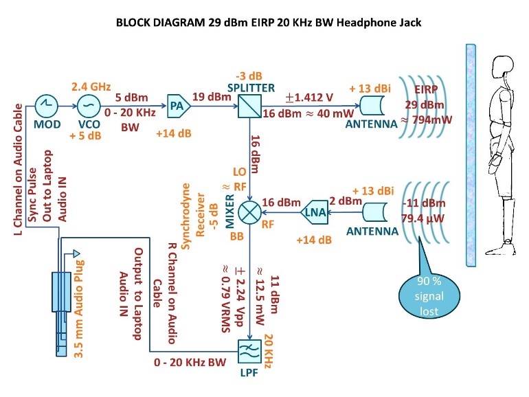 Now a data acquisition device had to be acquired it was found out that data acquisition devices that are available nowadays are quite big to be portable enough to use in the application so it required to figure out how to acquire signal using some handheld portable device. It was later suggested that if the transmitted bandwidth is kept at or below 20KHz which is within the frequency range of most audio processors and at such low frequencies (20 KHz) can be directly down converted from 2.4GHz using stolen carrier from the transmitter. The output can then be directly fed to a sound card of a computer or audio processor but the bandwidth of the system is greatly reduced which resulted in decreased range resolution, this technique could be useful in detection but this was not supportive in range measurement or object profiling.
