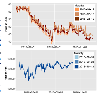 Figure 1: Prices of three WTI future contracts (top chart) and three Nikkei future (bottom chart) contracts with different maturities
