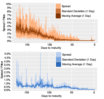 Figure 4 shows the application of the robust quote estimation for the two presented WTI contracts. By interpreting all current contracts, price evolutions are computed that are placed between ask and bid prices. This creates comparable quotes for all future contracts. The differences of ask, bid and robust estimation enables the separate rating of supply and demand. For instance, the significant increase of the spread at April 24 for the December contract is primarily generated by an unfavorable ask price that cannot be traced back to a general movement. The bid price does not show any illiquidities in this case.