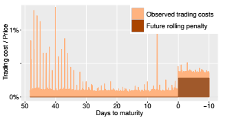 be the trading costs for an exceeded maturity. Future rolls consist of two trades: closing the expiring position at the last valid point before the corresponding maturity (t = c(0)) and re-opening the same position in a the consecutive contract (c(dτ)). The actual liquidation itself must be included as well and is delayed by dτ. Therefore, the overall trading cost is a sum of three values as shown in equation 4. Figure 6 illustrates these additional future roll costs for exceeded maturities.