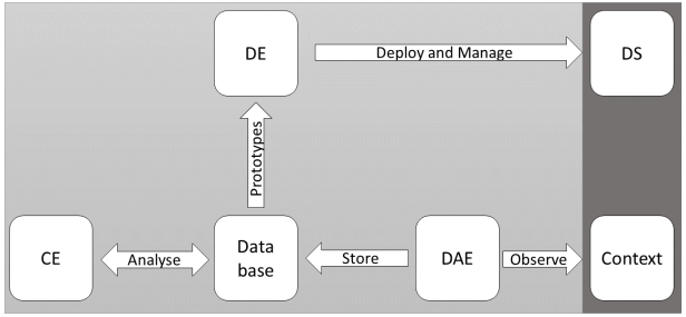 We developed an adaptive deployment framework consisting of a data acquisition engine (DAE), a clustering engine (CE) and a deployment engine (DE). A specific data format was also developed. In this chapter we describe our framework and the single components. The adaptive deployment consists of four consecutive processes: Context perception, context evaluation, configuration and deployment. In the first step the DAE collects context information such as other hosts. The acquired data is then stored in our data format. Based on this data, the CE statistically analyzes the stored data and determines k prototypes P . These prototypes P are DSs that are mind(P ,Si). The configuration process depends on the DE. In general, however, the required configuration file is generated in this process. Finally, the DE deploys the DSs based on the configuration file. The overall process of adaptive deployment is restartable at any time. This enables a fast adaption to changing architectures and contexts. The process is shown in Figure 1.