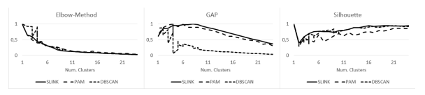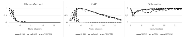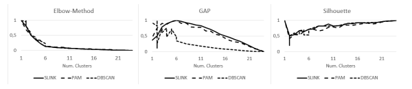 For DBSCAN the elbow method does not give a feasible result. The GAP method results only for SLINK in suitable results. PAM as well as DBSCAN result in a number of clusters of four. The silhouette coefficient only results in suitable values for the PAM. Figure 4 compares the results for the development network.