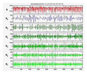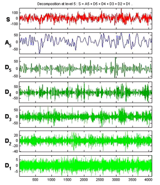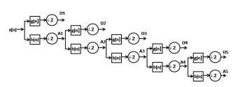 Where ψ, a and b are wavelet function called as scaling and shifting parameters. The quadrature mirror filters are used to realize the scheme by passing the passing the signal through a series of low-pass (LP) and high-pass (HP) filter [24] The out put from the low pass filter is termed as . Approximation (A) and output from the high pass filter id termed as detail (D) coefficients. The figure illustrates the fifth level wavelet decomposition of a signal showing the coefficients A1, D1, A2, D2, A3, D3, A4, D4, A5, and D5