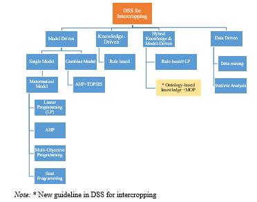 [10] presented an integrated DSS for intercropping by using a rule-based expert system as a model. This method can be extended to cover more decision criteria to cost the cropping. The objective of the work is to manage cropping activities for improved crop production. However, approaches ignore important features due to the paper not offering price statistics for the decision. This factor is necessary for planning crops. [11] showed the model-based support by using evolutionary algorithms to solve multi-objective optimization and design of mixed farming systems aimed to maximize the operating profit and organic matter balance, and to minimize the labor requirement and soil nitrogen losses. [12] presented the goal programming for rubber plantation intercropping with tea trees. The purpose of this work is management of rubber plantation yield before getting a return for seven years.