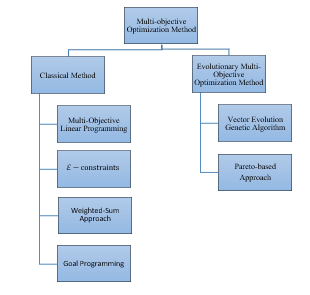This section and figure 2 presents a summary approach for Multi-Objective Optimization. There are classical methods and Evolutionary Multi-Objective Optimization (EMO) Method [25].