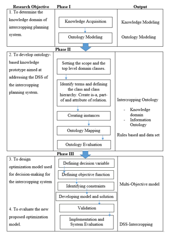 Ontology-based knowledge and multi-objective optimization programming to drive a decision support system for intercropping is based on constraint factors from an individual farmer for illustrating maximum income. The research methodology is divided into three phases as follows: (1) knowledge acquisition and ontology modeling. This methodology is based on knowledge‘s extraction from experts or specialists due to the fact of long experience based knowledge; (2) ontology development and recommender system is a creation of ontology as it is designed as well as a preparation of instance and ontology mapping as rules governing intercropping and evaluation and assessment of ontology; and the last stage is (3) design of multi-objective programming in order to obtain the answers of what types of plants should be planted, the proportion of each co-planting plants, overall generated revenue and production cost. The future work is knowledge acquisition and ontology modeling which is an important step to collect knowledge from experts and published papers issued by Department of Agriculture Extension, Ministry of Agriculture and Agricultural Co-operatives before being used for developing ontology at Phase II.
