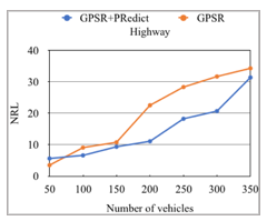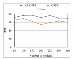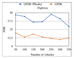 In figures 11 and 12, default GPSR seems to have worst performance in both scenarios, while our proposed GPSR+PRedict gives good values. This is because GPSR+PRedict anticipates in advance the changes of vehicles localizations. Thus, it avoids the problems caused by the high mobility of the vehicles and the dynamic nature of the topology. In the highway scenario, our approach remarkably improves the PDR compared to the default GPSR since the GPSR mismanages the very high mobility of vehicles.