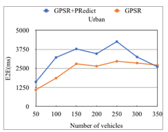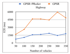 In figure 13, regarding the highway scenario, it can be noticed that the classical GPSR has the longer average end-to-end delay due to the outdated location information that results very probably data loss. While, GPSR+PRedict decreases End-to-end delay since it avoids the wrong routing decisions by using future position estimated, hence, the routed data packet will have less chance to be lost. In contrast to the urban scenario (see figure 14), we note that our enhanced protocol has the worst end-to-end delay. This is probably because of two things: its higher PDR compared to the default GPSR, and the mobility of vehicles, which is relatively inferior in this environment than in the highway.