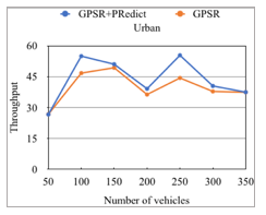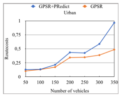 Initially, the objective of our experiments is to evaluate the effectiveness of our improved protocol, taking into account the impact of node density regarding routing quality of service. Therefore, we varied the number of vehicles to 50, 100, 150, 200, 250, 300 and 350 respectively, while keeping number of connections fixed at 15 connections. In order to guarantee the credibility and reliability of the experimental results, we respectively made 10 time experiments during 500 seconds for each simulation. The simulations result in both highway and urban are presented in figures 11 to 20, in which we illustrate the packet delivery ratio, the average end-to-end delay, the throughput, the route-costs and the normalized routing load for GPSR+PRedict and default GPSR.