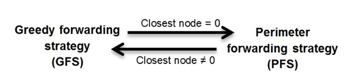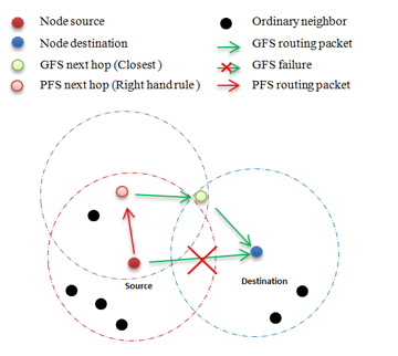 GPSR was originally created for MANET, but quickly adapted to VANET [27]. It is one of the most known examples that approve the concept of position based routing. GPSR protocol switches between two forwarding strategies depending on the situation of communicating nodes. Usually, when node needs to send packets, it uses the first forwarding strategy defined by greedy forwarding strategy (GFS). In case of failure (i.e., there is no neighbor with least distance to the destination except the transmitter node itself), GPSR bypasses the problem by using the second strategy known by perimeter forwarding strategy (PFS). Figure 2 illustrates the behavior of GPSR.