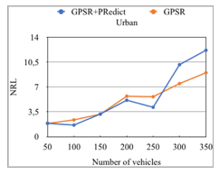 Figures 17 and 18 illustrate the cost of routing according to the number of moving vehicles respectively in both highway and urban scenarios. The simulation results show that GPSR+PRedict guarantees low cost of routing compared to the default GPSR in highway scenario (see figure 17). The improved protocol suffers less from link breakages, which conduct to less packet loss and less routing cost. As for results of urban scenario presented in figure 18, GPSR+PRedict has a very slight rise in cost of routing compared with default GPSR. These values can be justified by the high PDR of GPSR+PRedict in the same scenario.