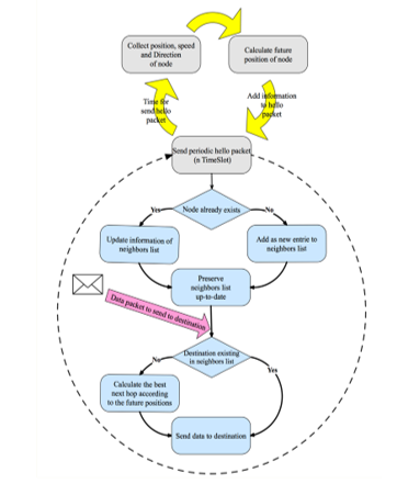 With the proposed protocol, each node uses its geographical position, its speed and its direction to estimate its position in a near future. This future position is attached to the hello packets and recalculated at each sent of periodic hello packet. In this way, node continuously has a prediction of future state of the network.