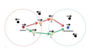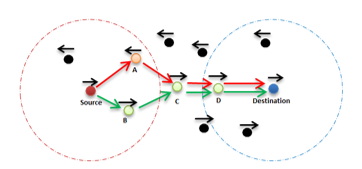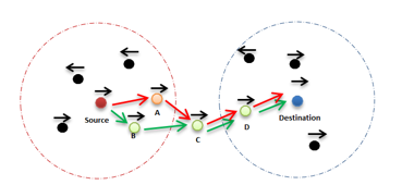 From figure 6, according to the default greedy strategy, the source node chooses the node A as the next hop since it is the closest one to the final destination. Nevertheless, the packet will be lost since the direction of A is different from that of the destination. The proposed mechanism forms the green route and avoids the problem of opposite directions that will occur in the red route in a very short amount of time.
