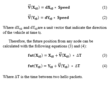 The choice of the prediction model is fundamental because it does not affect only the quality of prediction but also the speed and time of the calculation. In fact, there are different mathematical extrapolation methods with different levels of complexity allowing the estimation of future positions of vehicles [35-37]. For this study, we have opted to use a method based on previous positions, direction and speed. This technique is basic with very little intricacy so that the hello packet size does not involve the network overhead (i.e., it does not incur much bandwidth or computational power).