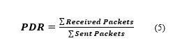 Packet Delivery Ration (PDR): corresponds to the ratio between the number of packets of data correctly received by the destinations and the number of packets sent by the sources; this latter allows revealing whether a protocol is able to send all outgoing data packets. The final equation of PDR shown in (5):