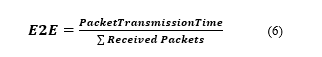End-to-End delay average (E2E) is defined as the average time that a data packet takes to travel from the source to the destination vehicle. It represents the main parameter that must be improved during the evaluation of a routing protocol. A good protocol must have an end-to-end delay average as low as possible. Its calculation is as follows in equation (6):